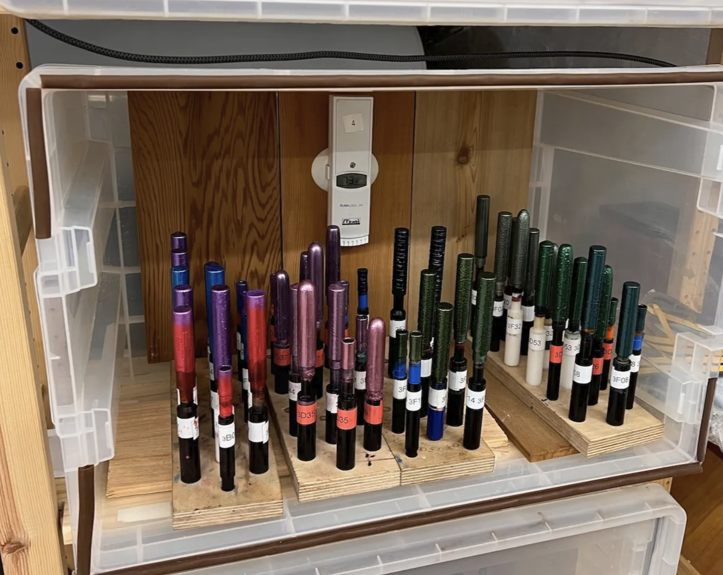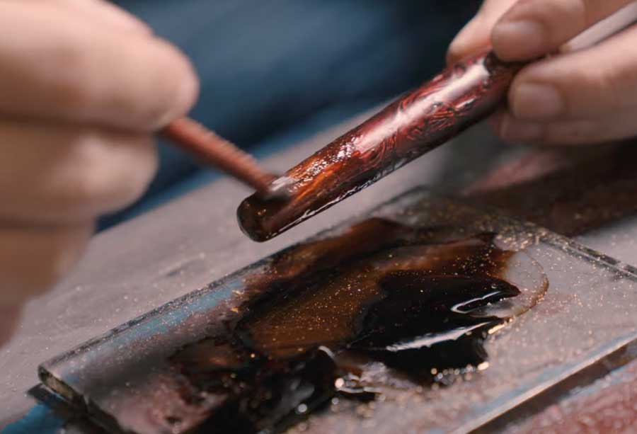 This is the most time-consuming part of the process. The artisan applies the lacquer in many thin layers. Each layer requires careful brushwork to avoid bubbles or streaks. After each coat, the pen goes inside a muro, a humidity-controlled box.